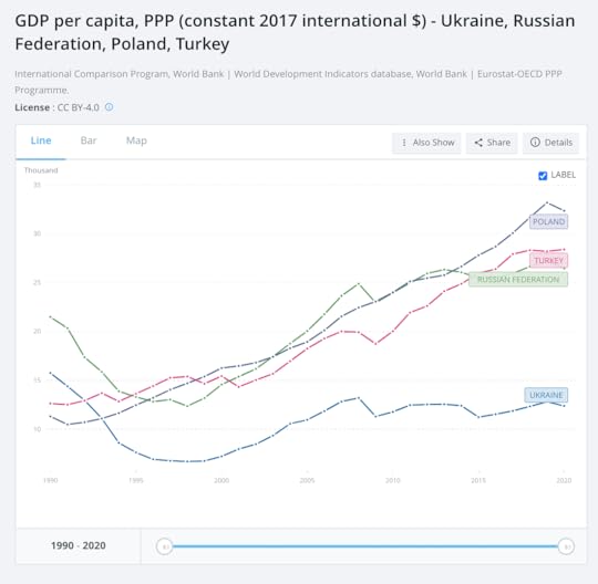 The end of the Soviet Union may have given Ukraine independence but for Ukrainian society at large it has been an economic disaster. Like Russia, Ukraine suffered a devastating shock in the 1990s. GDP per capita in constant PPP terms halved between 1990 and 1996. It then recovered to 80 percent of its 1990 level in 2007 and has stagnated ever since. Thirty years on, Ukraine’s GDP per capita (in constant PPP dollars as measured by the World Bank) is 20 percent lower than in 1990.