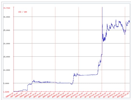 GDP per capita numbers paint a picture of painful stagnation. In addition, Ukraine’s weakness have left it vulnerable to repeated and painful foreign exchange and financial crises, best summarized by the erratic chart of the hryvina’s devaluation against the dollar and euro. There were big shocks in the late 1990s. In 2008. In 2014-5. Since 2015 the hryvina has swung around a new plateau. Given the depreciated level of the currency, in percentage terms the swings are now smaller. But Ukraine continues to be a fragile ward of the IMF.