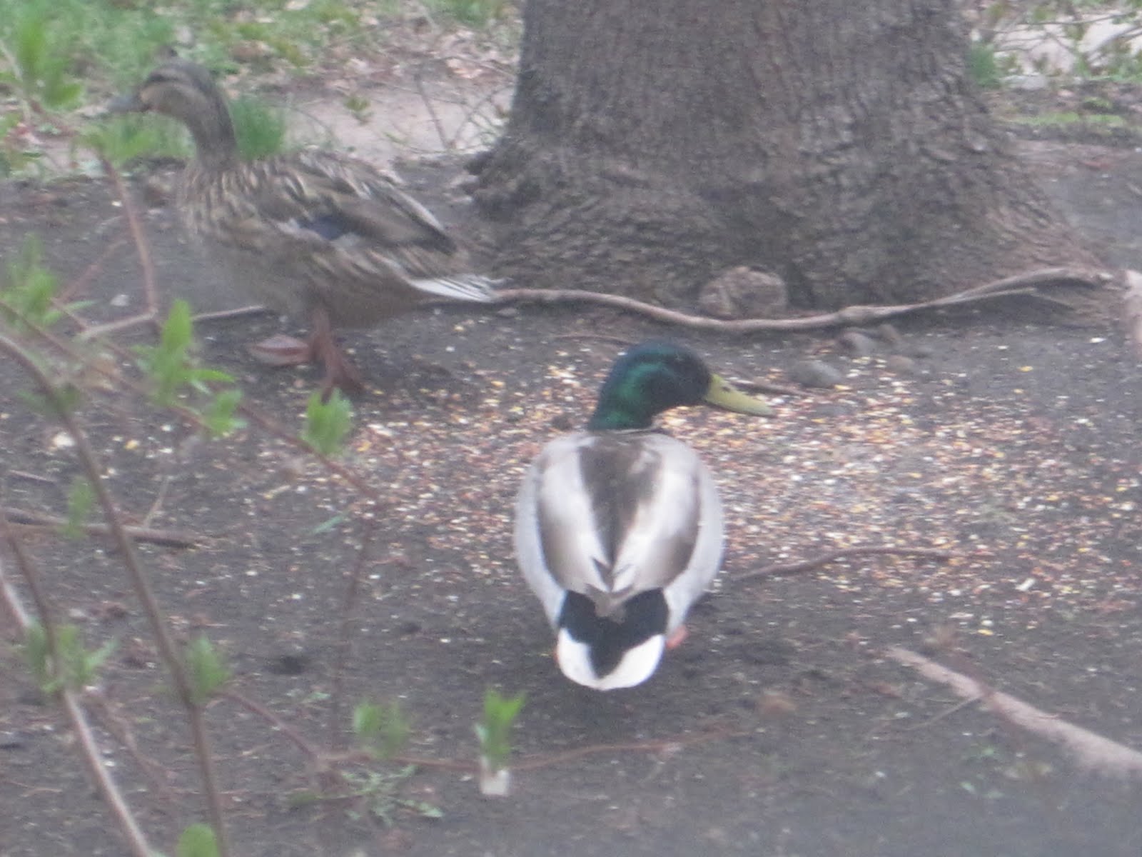 This morning we woke up to these two visitors to our front yard. I took this picture through the front window, which is why it's a bit blurry. I didn't want to disturb the drake (though you can see how closely he's watching me, anyway.) They may be considering nesting near the nearby Iris Park fountain, though that hasn't been turned on for the season yet. Perhaps they're considering the little pond by the old folks home? Who knows. It's not very usual for us to see ducks in the neighborhood, though a couple (this pair) did stop by several times many years ago to our neighbor's yard, because I think she, too, like us had a mix high in cracked corn, which the ducks seem extraordinarily fond of.