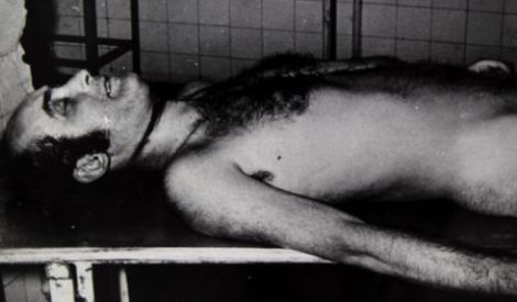 Uma foto do corpo do jornalista VLADIMIR HERZOG, na mesa de autópsia.