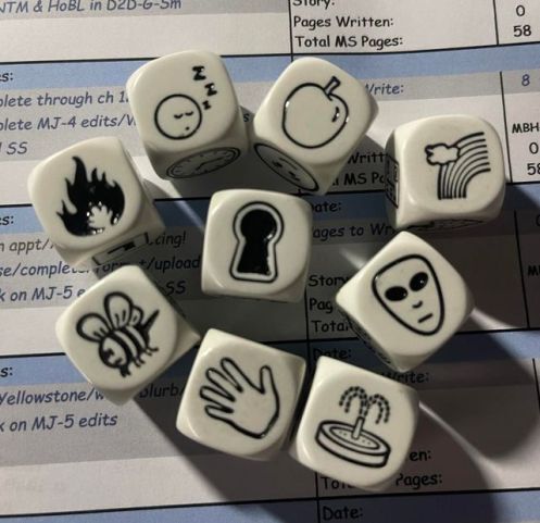 I bought this little brainstorming tool years ago at some writers’ conference. “Story Cubes” is a brainstorming game. You roll the dice and whatever pictures appear face-up are the ones you use to riff off a story.