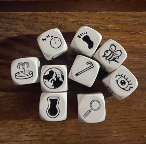 I bought this little brainstorming tool years ago at some writers’ conference. “Story Cubes” is a brainstorming game. You roll the dice and whatever pictures appear face-up are the ones you use to riff off a story.
