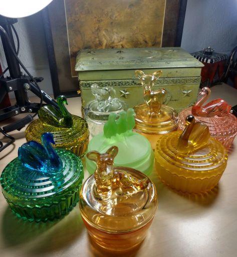 The problem with collections is that they take up space and are often non-functional. The other day on Delilah’s Corner, I shared a photo of my collection of vintage vanity table powder jars, to start a conversation about weird collections anyone might have. Yes, powder jars were a thing. Mine don’t contain powder! My jars date back from the 1930s to the 1950s. See all those swans below? You can rest a lipstick tube between the wings. So cool! Okay, so maybe you just see them as dust collectors, but I adore them—especially, the animal-themed jars.