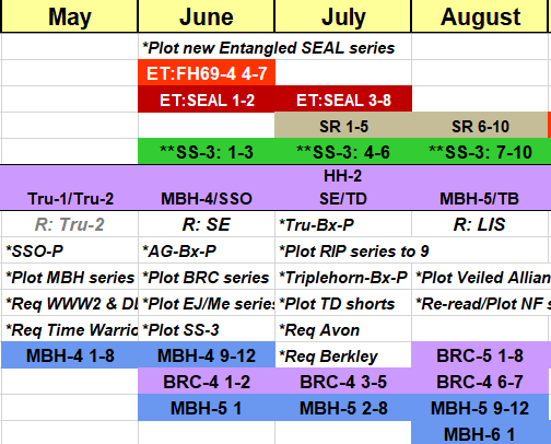 I try not to re-jigger my plans, except at the end of the month. Otherwise, I spend too much time working on plans rather than working on writing/editing. However lately, I’ve had to revise and revise. New projects added. Some deleted. The death of Kindle Worlds (in July) suddenly gave me “space” I felt the need to fill.