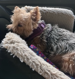 This is Sherlock. He was a rescue and the shelter had pulled all his teeth. Our first meeting was in a yard full of dogs and all were running around but Sherlock came and leaned against my leg and sat at my feet for to be petted. He goes everywhere with me.