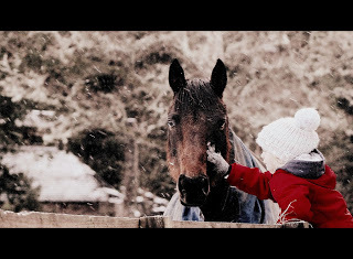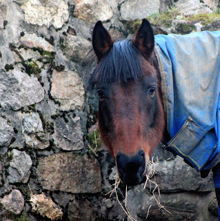 On the wireless, doomy voices predict a thundersnow apocalypse. In the quiet Scottish field there is a bit of wind and a flurry of blizzard and then the weather gives up, as if it can’t be bothered. The horses, stoical to the last, hunker down under their favourite weather tree and look slightly askance when we tell them it is time for breakfast. Eventually, they mosey on over, as if conferring a great favour.I have a small helper with me. She thinks the horses are perfectly splendid. ‘Can I stroke her? Oh, she is soft. She is furry. She is dirty.’ (The little brown mare had been having a roll and the top part of her neck that was peeking out of the rug was covered in mud.) ‘She is hungry. She likes that food. Can I stroke her again?’