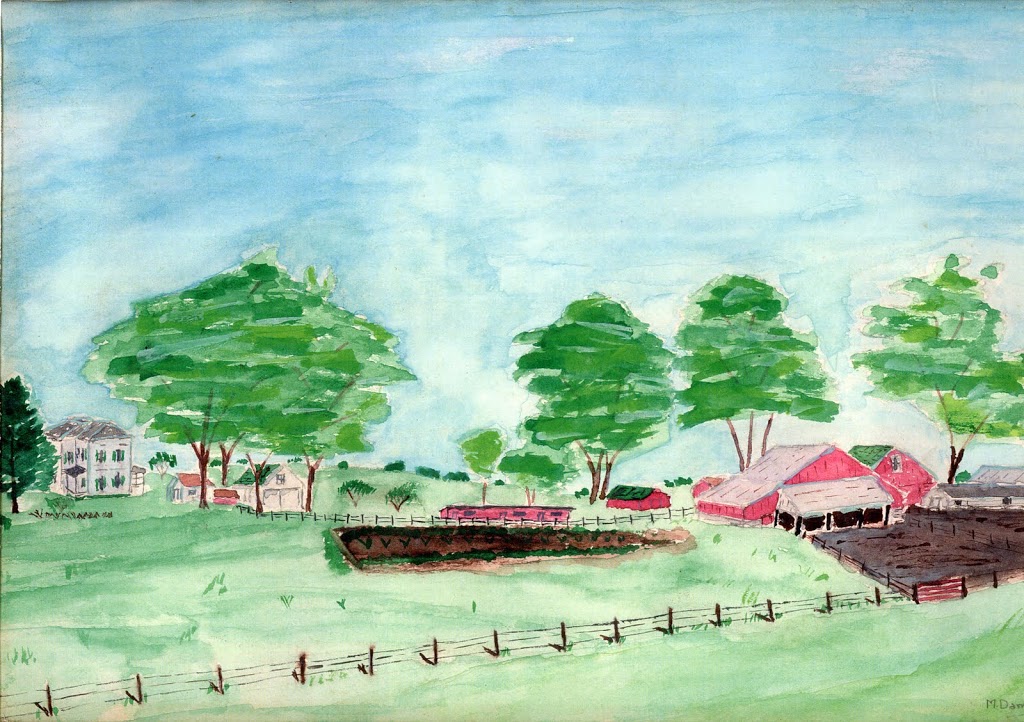 A watercolor my father painted of the family farm, his own beloved sense of place that spawned me.