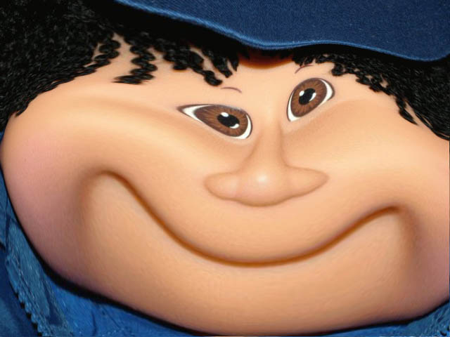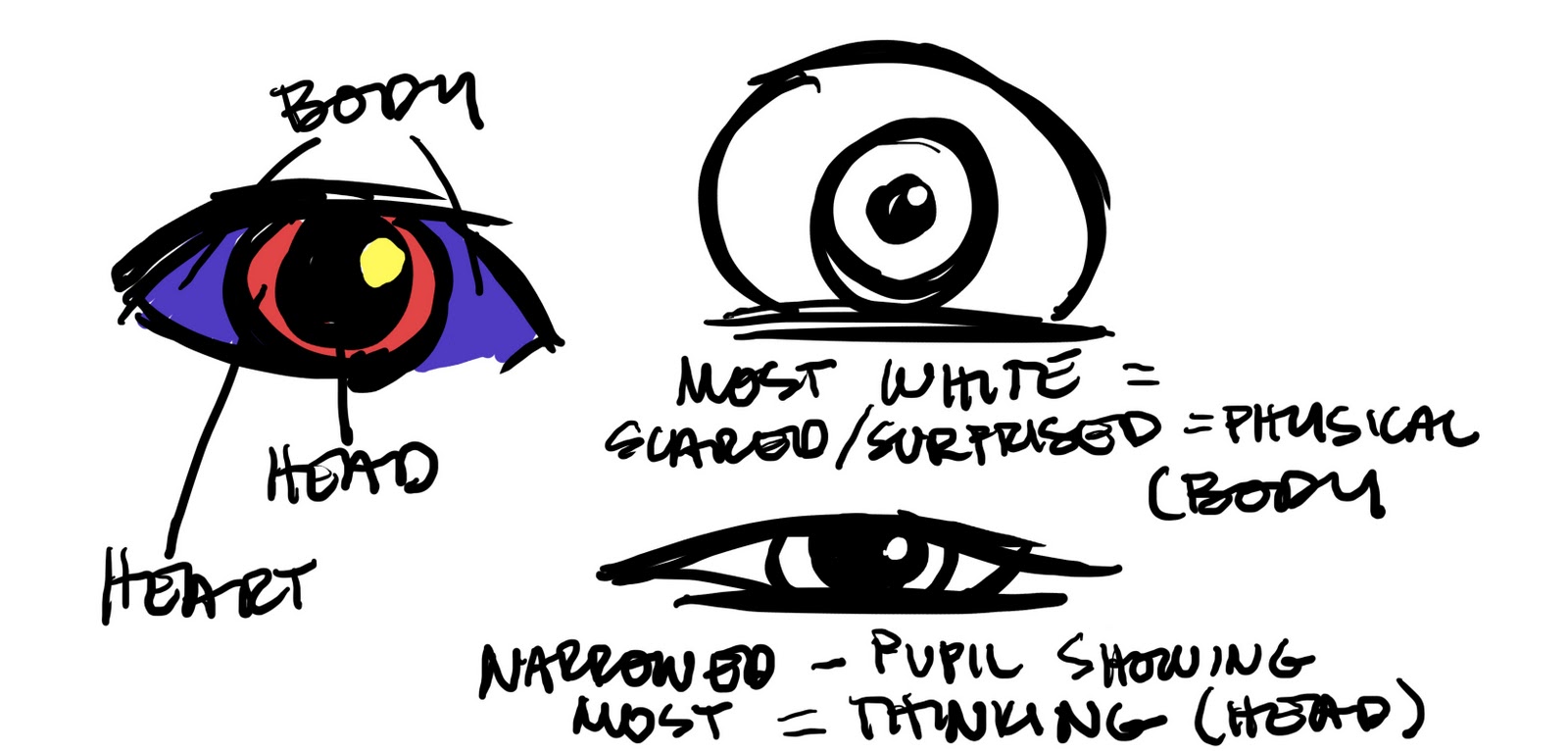 The eyes, for example, are split: head in pupil, iris is heart, and white is body.