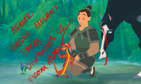 Mulan, because her armor is masking her form. So, in Delsarte world she is less readable and relatable.