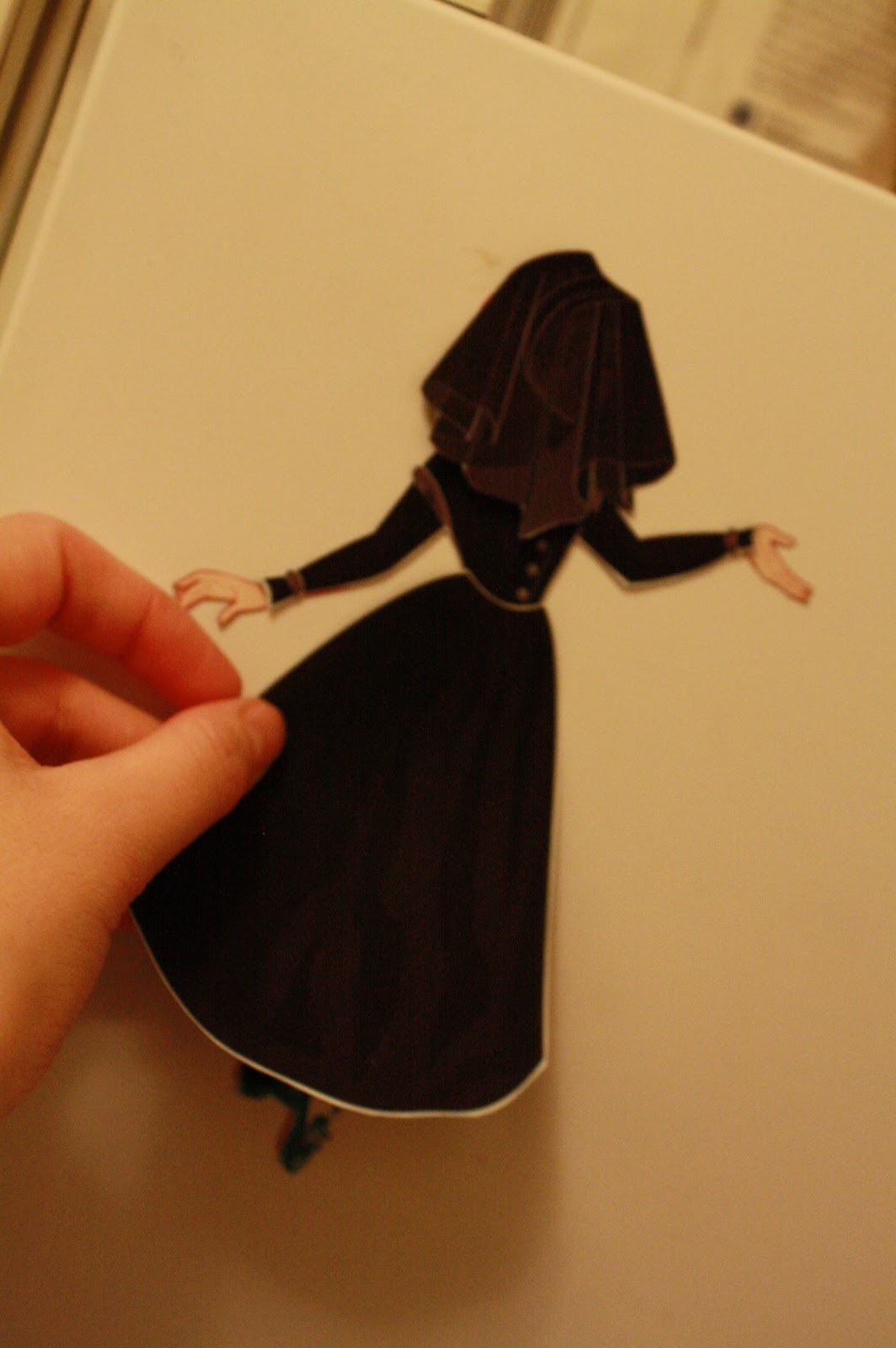 Magnet sheets are nice because you can layer them.Originally ALL the outfits were going to be black, as per the Entwined story, but that was a whooooole lot of work for just a one-note joke, and I am nothing if not a lazy bum. They're historically accurate though*, so now you can impress your friends with your knowledge of garibaldi blouses. You're welcome.