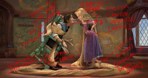 Rapunzel. Convex gesture (very willful) hand on hip (sensual) (Delsarte thought a gesture like this was "vulgar") Purple, which has no head color in it. (She does have her feet on a head position, which gives her a sassier tone.)
