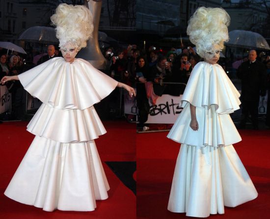 At the other end of the scale, this picture of Lady Gaga. She's masked her face, form, and head, and so the audience is distanced emotionally from her.