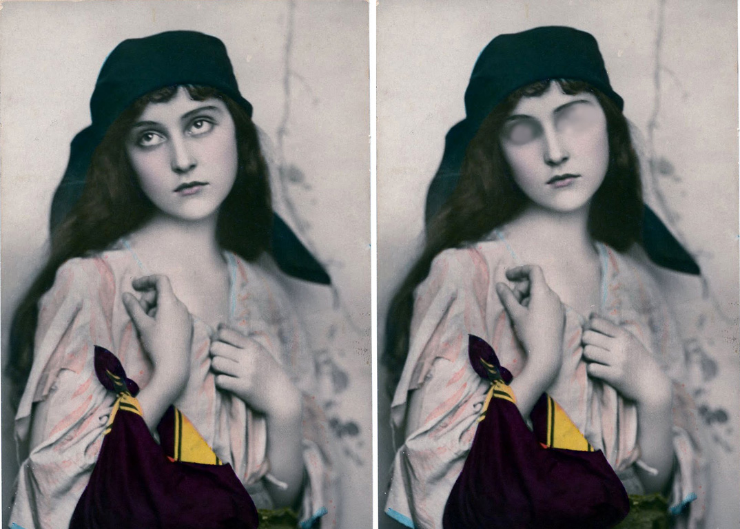 Animate a mask around the eyes as they blink. (Add a little feather to the edges)[image error] Desaturate, superimpose over the top of the vintage pic.