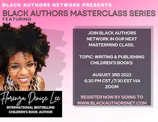 INTRODUCING Master Classes featuring USA TODAY and National Bestselling Authors Sponsored by Black Authors Network! Wednesdays, 6:30 pm CST / 7:30 EST Via zoom. August 3rd is WRITING CHILDREN’S BOOKS FEATURING INTERNATIONAL BESTSELLER, FLORENZA DENISE LEE. These Master Classes will continue throughout September. You will learn from a team of industry professionals that specialize in Marketing, Book Production, Writing, Editing, Distribution and so much more! You want to become a bestseller? Then don’t miss this opportunity!