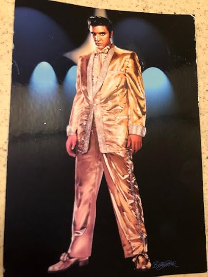 Well, ain't this a hunka-hunka burnin' love, a 12-inch doll of Elvis Presley straight outta 1984, and wearing his iconic gold lame suit! How can you not love that!? In the latest episode of the Terrific non-TV Toys series, you'll get up-close to the bric-a-brac and everything else on this delightful piece by the Eugene Doll Co. and endorsed by that magical place that is Graceland. Shout-out to Slim on this one!!! She's the one who got me the postcard shot below of Elvis in that famous suit!