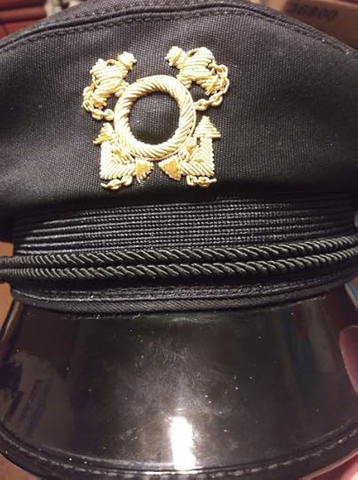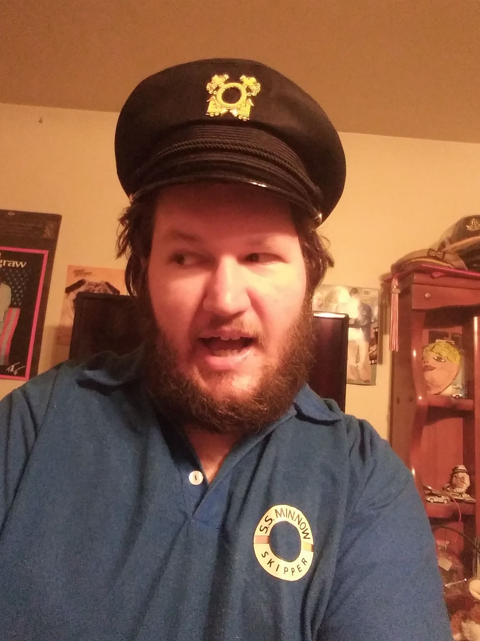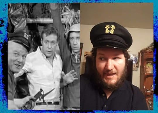 He's a testament to determination, our friend Bobby. For years he has wanted a screen-accurate replica of the hat Alan Hale wore as the Skipper on "Gilligan's Island." For 30 years, actually. He bought other hats over the years that were close, as you have seen on this very blog. But they were never quite "the" one, when it came to Skipper's Lancaster Uniform Co. hat. Not quite the right trim, or braiding. Maybe not the right color, or brim, or emblem design. He waited and searched. He was very patient. And now, at last, he has his hat and his proper tribute to the character he loved on the classic TV show. He ordered it on eBay in October 2020, and it came all the way from Sialkot, Pakistan. Thanks, Bobby, for sharing your photos with us! Here he is recreated Skipper's mannerisms in his new hat, as well as a S.S. Minnow shirt.