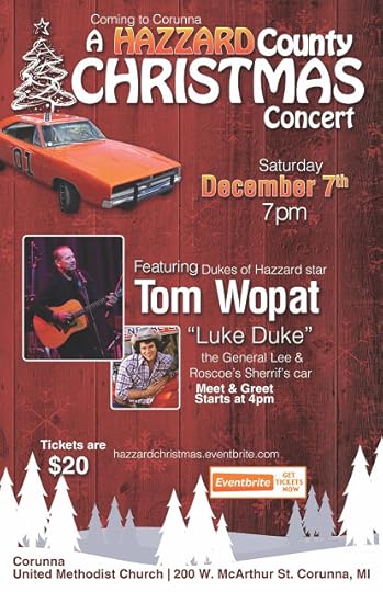 You already knew from the August 1 post of this very blog that Tom ("Luke Duke") Wopat, star of "The Dukes of Hazzard" as well as various great Broadway productions, is returning to Corunna, Michigan, this December for another good-ole Hazzard County Christmas concert. It's almost like we're becoming Hazzard North up-in-here (coo-coo-I-love-it-I-love-it!!!). Now, event organizer Pastor Steve Rau has finalized the flyer for the event: