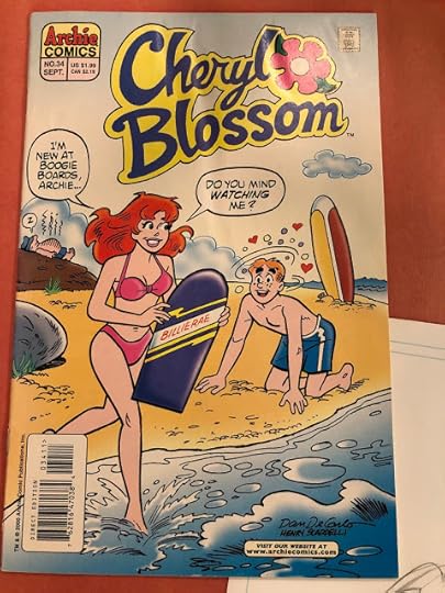 At the time, I was living in downtown Detroit and working at The Detroit News. I was a subscriber to the Cheryl Blossom title of Archie, since I intended to collect every appearance of the character. (For you millennials, that meant the paper copy of the comic actually arrived in the postal mail!) When I got the comic issues, I would put them on a stack in my apartment for reading in the workout room downstairs. One morning that summer or fall of 2000, I unsuspectingly grabbed the top couple issues off the stack to go downstairs and do my workout. While I was huffing and puffing on the stairstepper, I just about had a heart attack. There, staring me in the face from the cover of Cheryl Blossom No. 34, was my own name written right on the boogie board Cheryl was carrying: