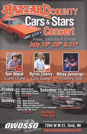 This author never would've dreamed, growing up in mid-Michigan, that the stars of such a favorite show, "The Dukes of Hazzard," could actually be dropping by for a visit a mile down the road from home. But yea, it's happening -- the very racetrack from which I could once hear the vroom-vroom sounds off in distance every Saturday night in the '70s and '80s summers at the farm, will shine with "Dukes" stars next month: Tom ("Luke Duke") Wopat and Byron ("Coy Duke") Cherry will be featured at the Hazzard County Cars and Stars Concert at the Owosso Speedway (which at one time was called the Ovid Speedway). Wowzers. How crazy is that????