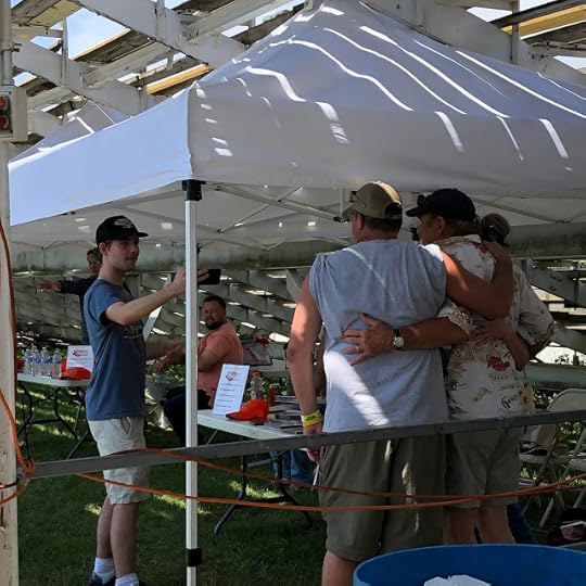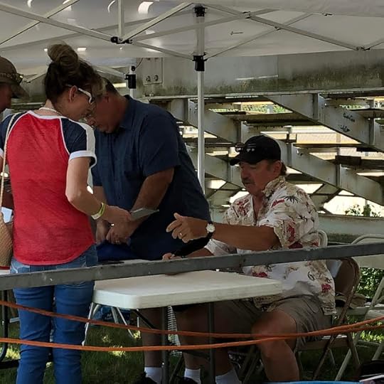 These photos are from yesterday, when Tom ("Luke Duke") Wopat and Byron ("Coy Duke") Cherry of "The Dukes of Hazzard" signed photos for fans. Tom said he didn't mind the intense heat, as he snagged himself a hotdog from the concession stand, and Byron was his always-friendly self, there to meet with fans no matter the circumstances (I'm thinking of one particular Georgia event years ago when he was sick as a dog but still showed up smiling!). In the afternoon we were treated to a car chase with a General Lee, Rosco's sheriff's car, and a yellow Plymouth Road Runner (Daisy-inspired), in a "Dukes" scene featuring Byron and a few friends who are avid "Dukes" fans -- Brian, Kristy, T.J. It was adorbs. Then Tom took to the stage and gave a wonderful concert.