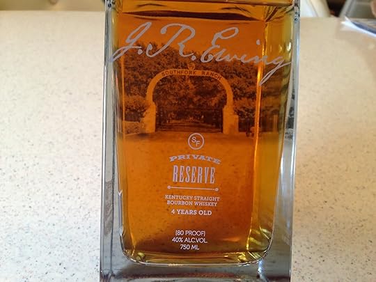 But on to the sauce! The bottle is square and regal and solid, all 750 mL of it. It's 80 proof. It's four years old and from Kentucky. And you can see an image of Southfork Ranch through its front ...