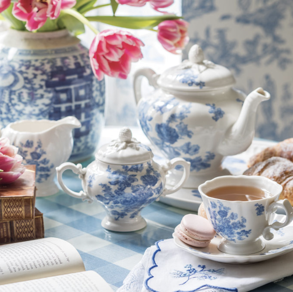 The Victoria Magazine blue roses tea setThe final article is from Vogue and shares the surprising uptick in fancy tea set sales since Bridgerton came on the scene. Thanks to Bridgerton, Fancy Tea Sets Have Become the New Home Must-Have. It's not surprising that a popular television program launches fashion trends, but I find it very curious that high-end tea sets have been one of the emerging style desires of Bridgerton fans. Some beautiful tea sets to consider are the Victoria Magazine blue roses tea set, And the tea sets featured at Riverbend Home.