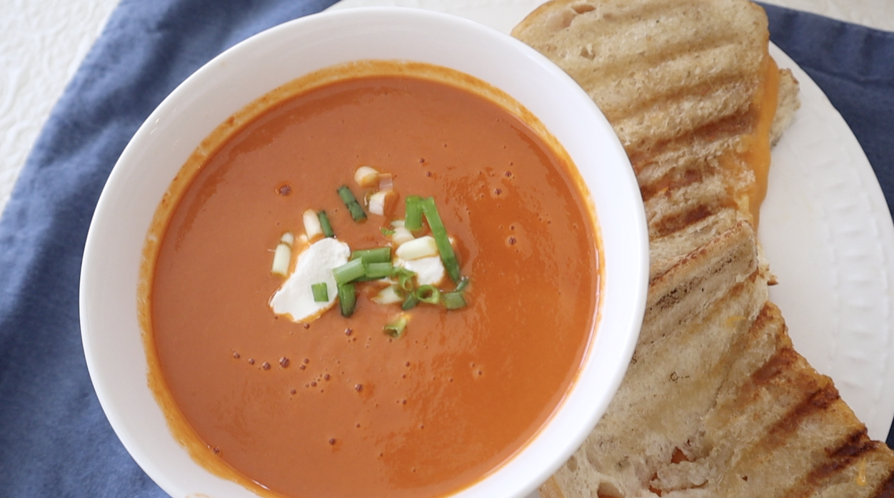 Soup and salad or soup and sandwich This one is delightfully easy and still satisfying. I like to heat up a nice tomato soup on the stove and fry up a few grilled cheese sandwiches on sourdough bread. I serve the soup with a dollop of sour cream and a very easy meal has just been served.