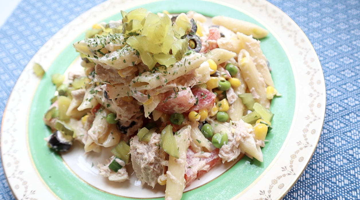 Tuna pasta salad This classic pantry dish is a family favorite. My mother made this for us and I, in turn, enjoy serving it to my family... even on days I don't feel like cooking. I usually have all of the ingredients and can whip this up in no time. Boil and drain your pasta (I like to use penne or fusilli), Add mayonnaise to taste, garlic salt, and whatever ingredients you have on hand. I like olives, corn, pickles, peas, etc. Don't forget to add the canned tuna (drained). Delicious!