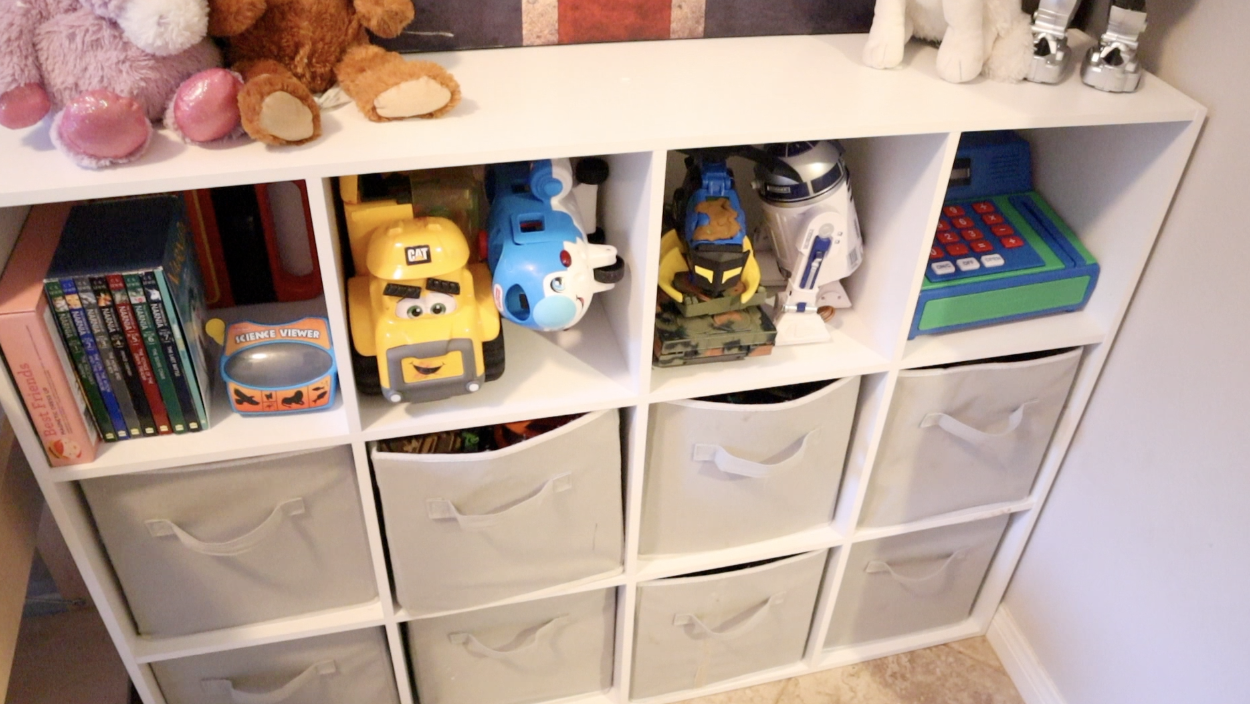 The solution: A cube storage system with canvas bins allow toys to be categorized for easy clean up. An ottoman that doubles as a storage chest allows for easy clean-up with toys in the family room.