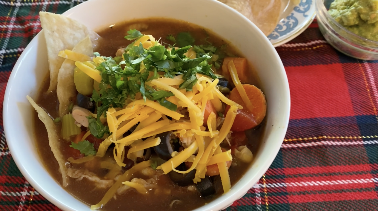 When I make soup, I usually place whatever related ingredients I have on hand into the pot, which is what I did today. I used the rotisserie chicken here and it made the soup so easy to assemble. I also used carrots, celery, olives, corn, and cilantro, along with several cups of chicken broth. I like to serve this topped with cheddar cheese over tortilla chips and serve extra chips on the side with fresh guacamole. I seasoned the soup with 1 Tbs ranch seasoning and 1 Tbs taco seasoning.