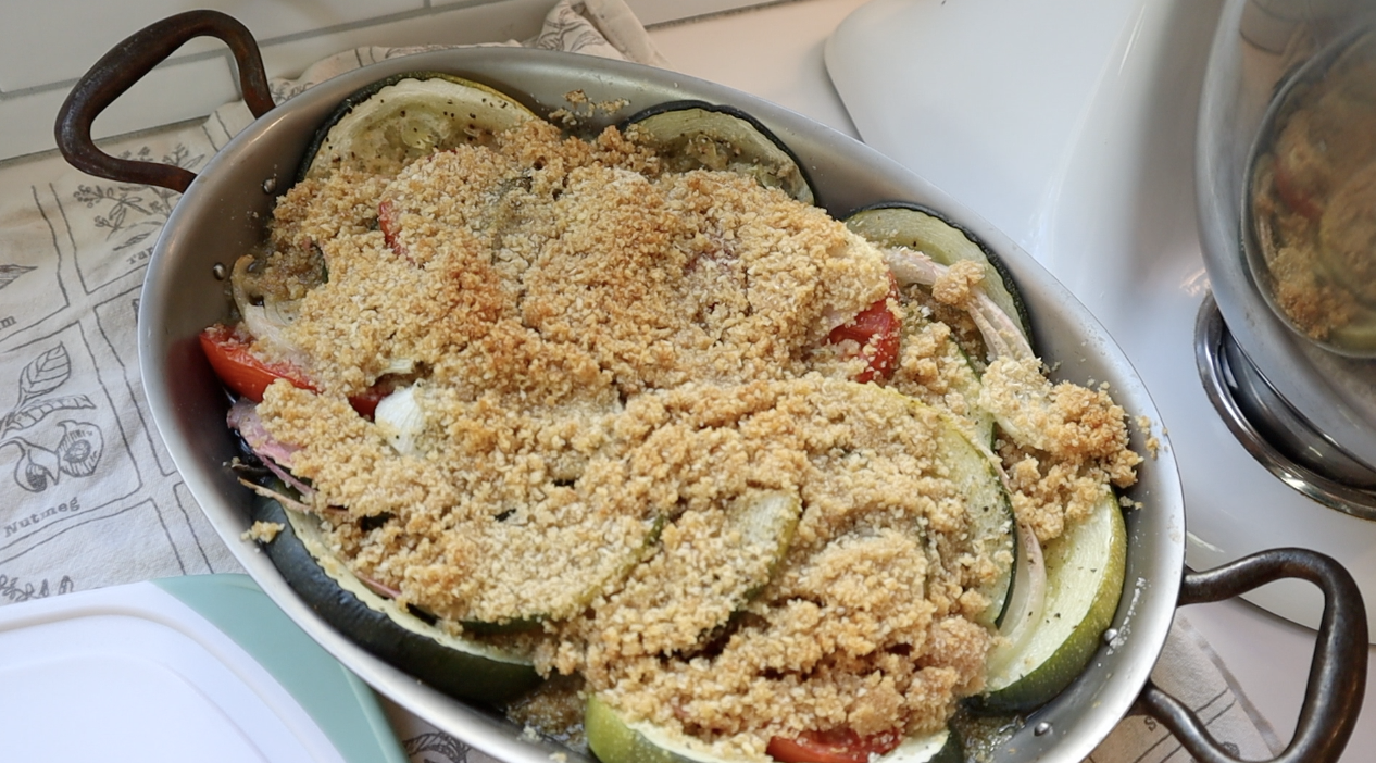 I made this recipe up so I could use up some garden produce. Slice a zucchini and two large tomatoes. I used the beefsteak tomatoes we have been enjoying this summer. Also thinly slice one medium onion. Drizzle olive oil in a gratin dish and arrange the vegetables beautifully with the onion. Top with more olive oil, salt, pepper, and whatever seasonings you enjoy. Finally, top a mixture of breadcrumbs and melted button on top. Bake at 400 degrees for 20 minutes.