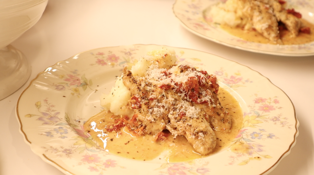 Return skillet to medium heat. Add garlic and cook for 1 minute. Stir in thyme, red pepper flakes, chicken broth, and heavy cream. Cook for 5 minutes, stirring often. Stir in sundried tomatoes and parmesan cheese.