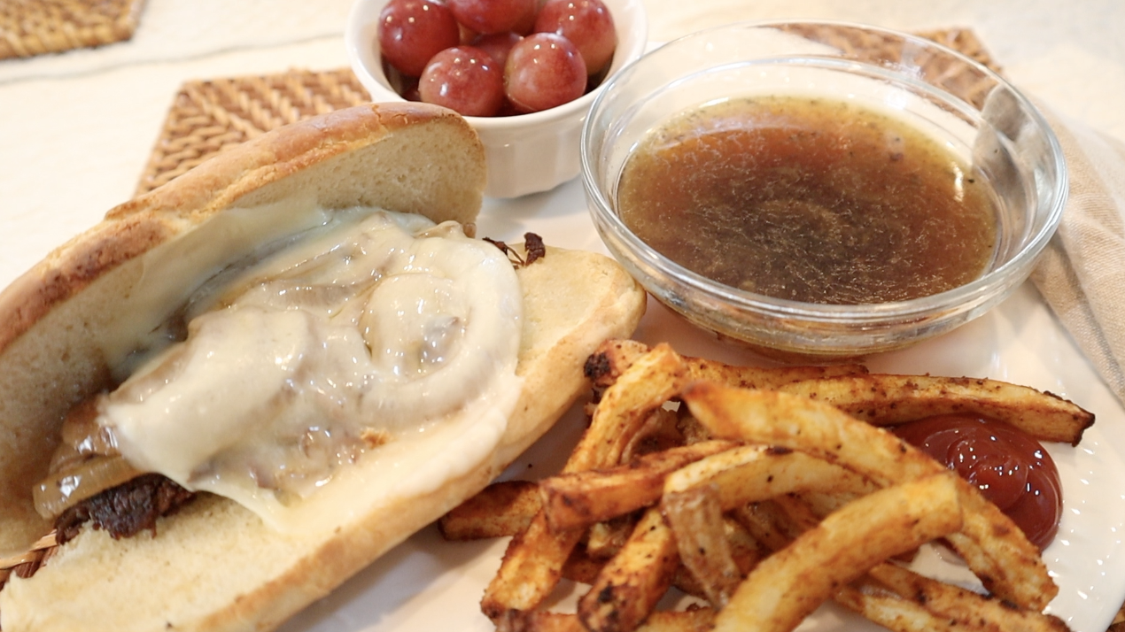 When the roast is cooked, heat the French sandwich rolls in the oven until they are toasted. I like to spread butter on the inside of the rolls. Place the shredded roast and onions on the rolls. Place smoked provolone cheese on top of the meat and return the sandwich to the oven for another minute until the cheese is melted. Serve with a nice bowl of the au jus (the sauce from the slow cooker). I like to use these au jus bowls. We also serve with French fries (see the recipe for that below).