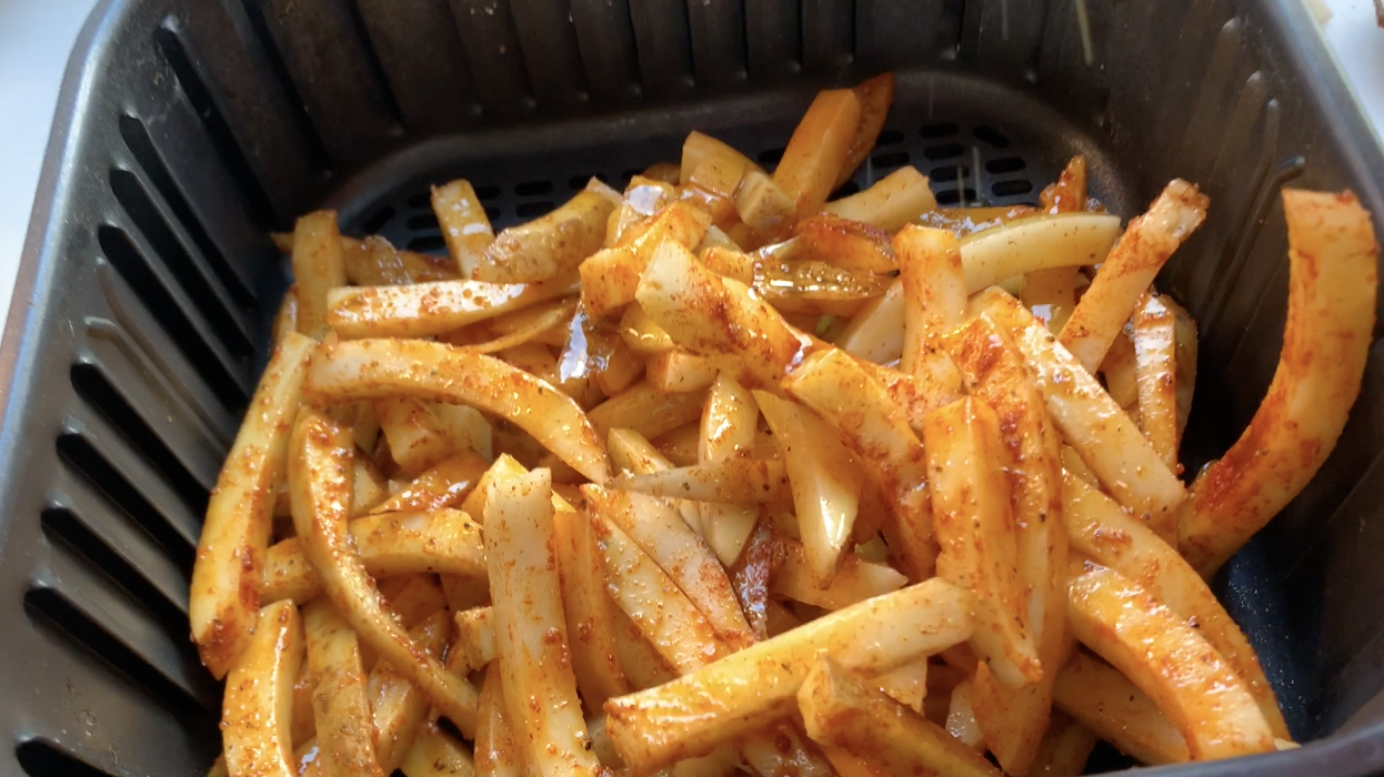 Use a French Fry chopper to chop your potatoes. Allow them to soak in water for 15 minutes. Then drain the water and pat the potatoes dry. Mix the oil, paprika, garlic powder, salt and pepper with your potatoes.
