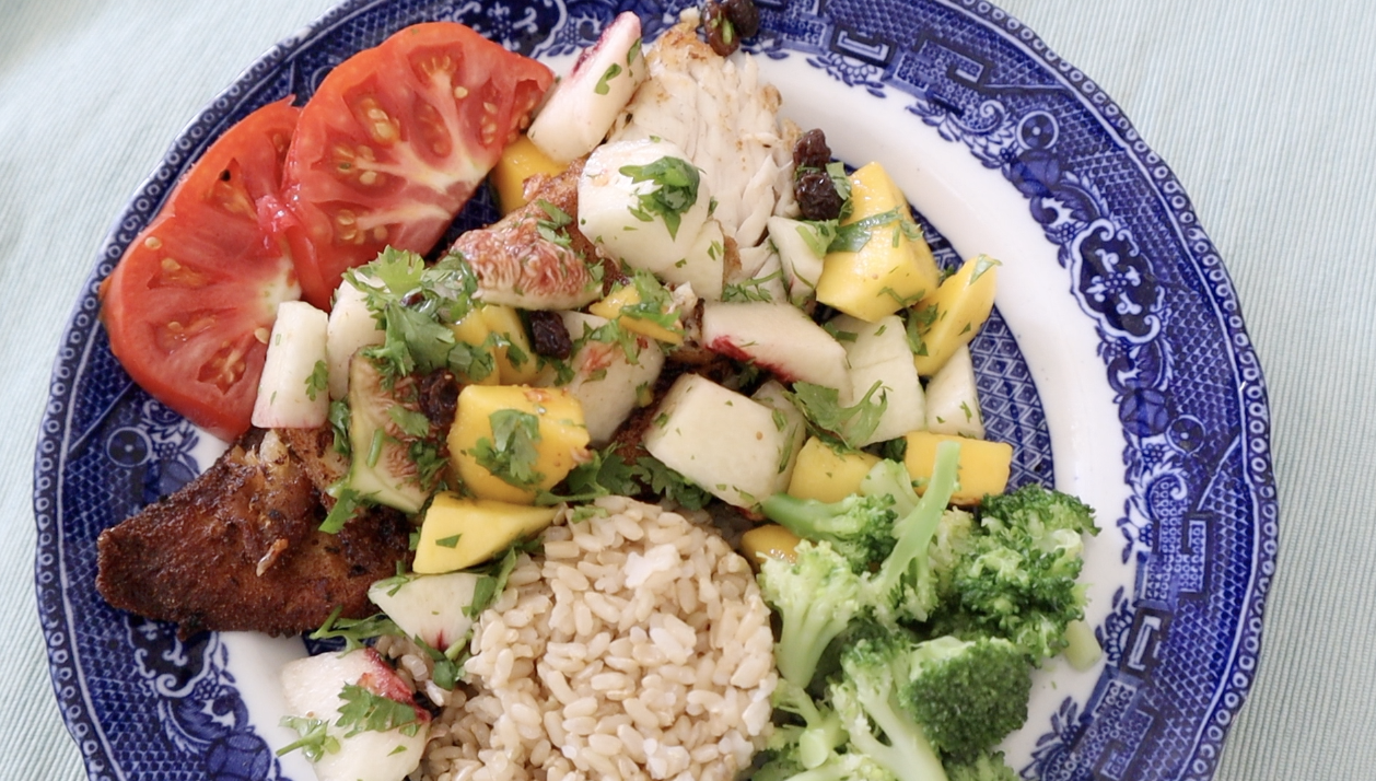 Heat the coconut oil in your skillet (I use my cast iron skillet) over medium heat. Season both sides of the fish with salt and pepper and rub in the spices. Fry about 3 to 5 minutes per side or until cooked through. Chop your fruit and place in a bowl with the raisins. Squeeze the lemon juice over the salsa (I like my new lemon squeezer), and add the chopped cilantro. Serve the fish with the fruit salsa on top. I like this with brown rice, steamed broccoli, and chopped tomato.
