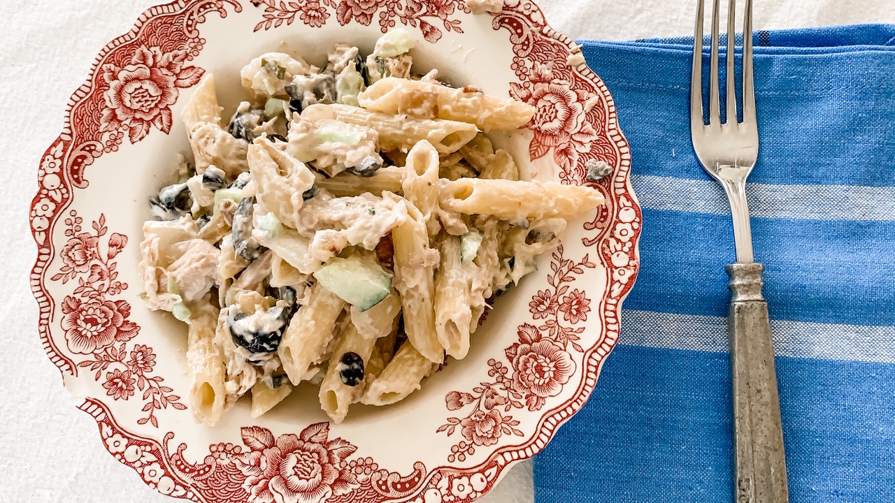 Tuna pasta salad is a staple in our home and is easy to make when we are low on fresh food. This has pasta, tuna, olives, pickles, cucumber, and caramelized onions (chopped apples are great with this too) mixed with mayonnaise and garlic salt. So yummy. The French blue napkins are from Amazon.
