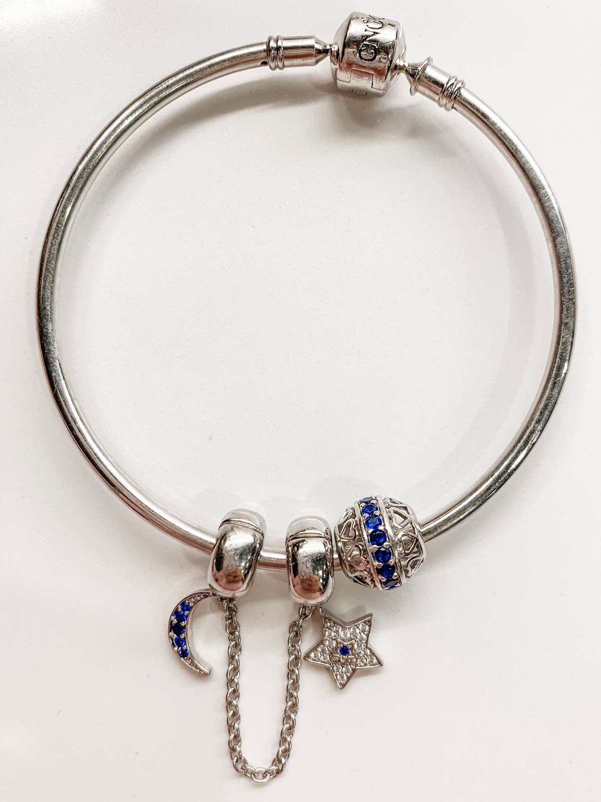 The bracelet is composed of the basic bangle sterling silver bracelet, starry night safety chain, and heart with blue stone charm. Their sterling silver bracelets are delightful!