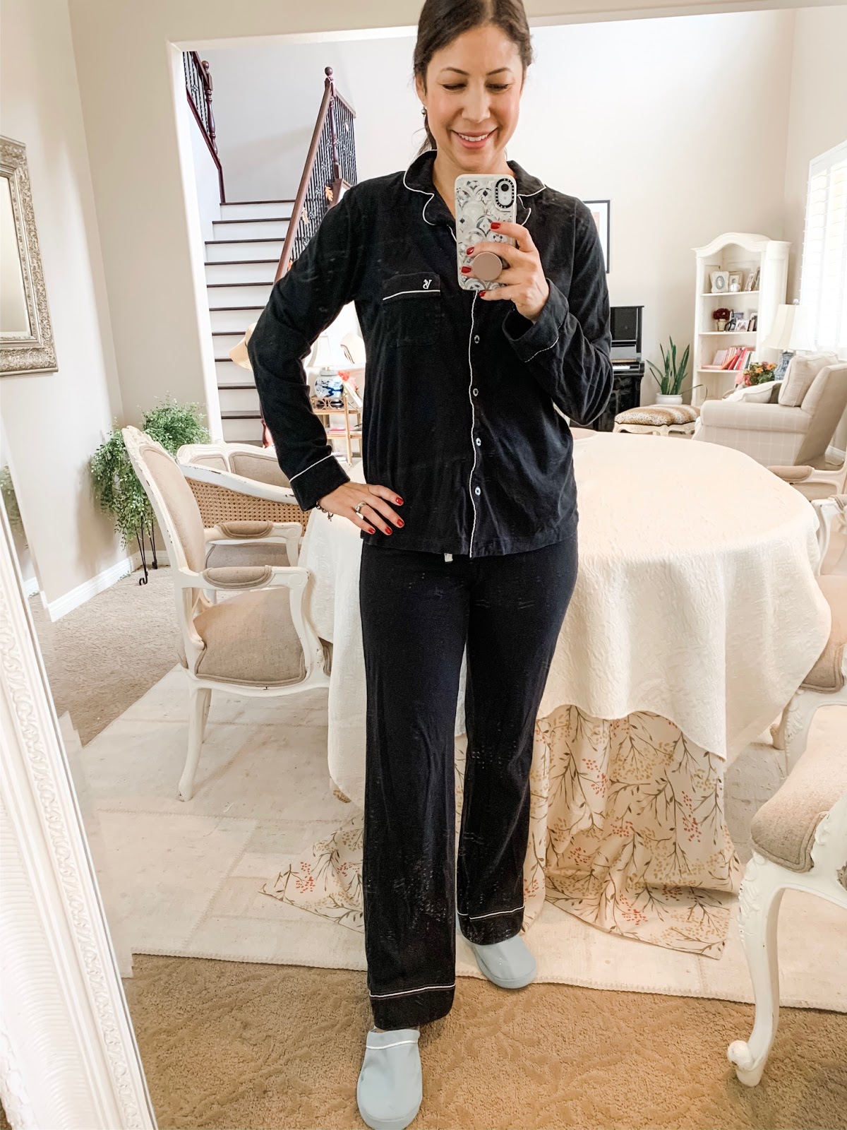 A Pajama set is an essential for presentable sleepwear. Whether you like wild prints, or more subdued sets like this black set with white trim (linking similar), a nice pajama set is a presentable option and great to wear, especially if you are a guest in someone's home.