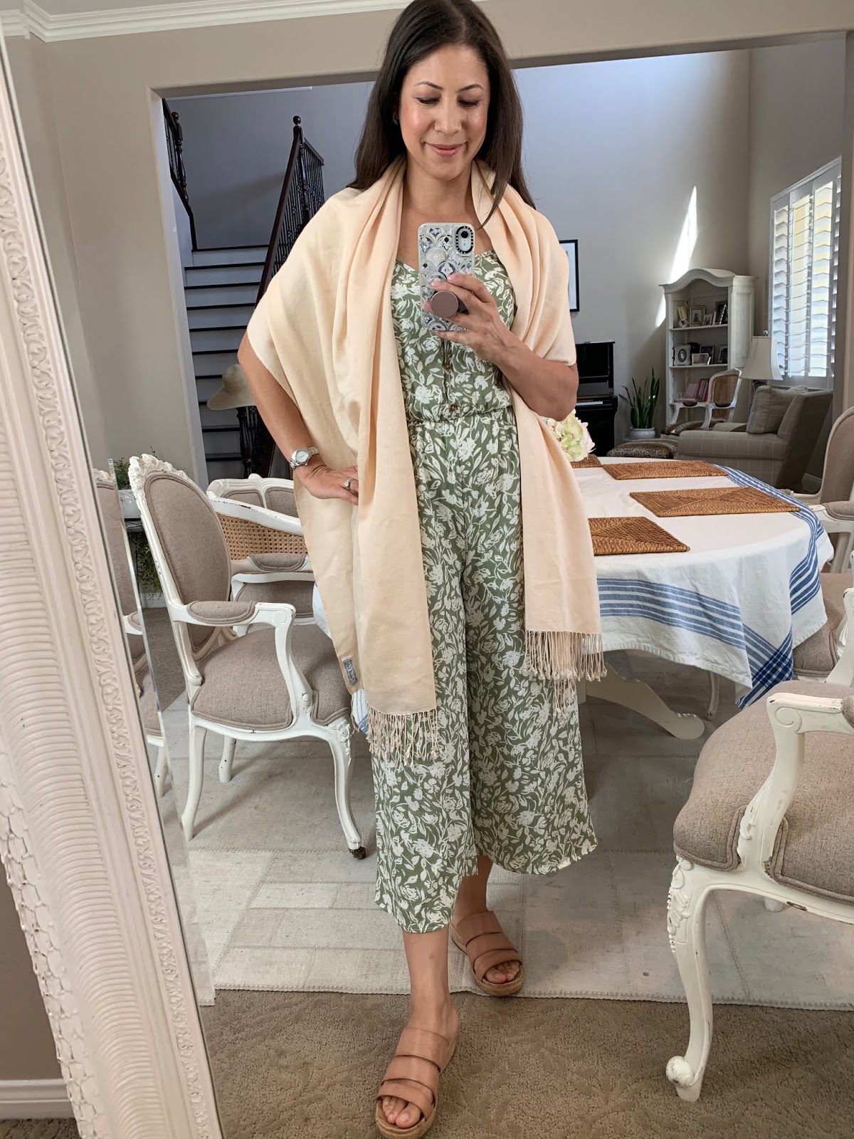 A cardigan pairs beautifully with a flowy jumpsuit like this. (Linking a similar one in cashmere).