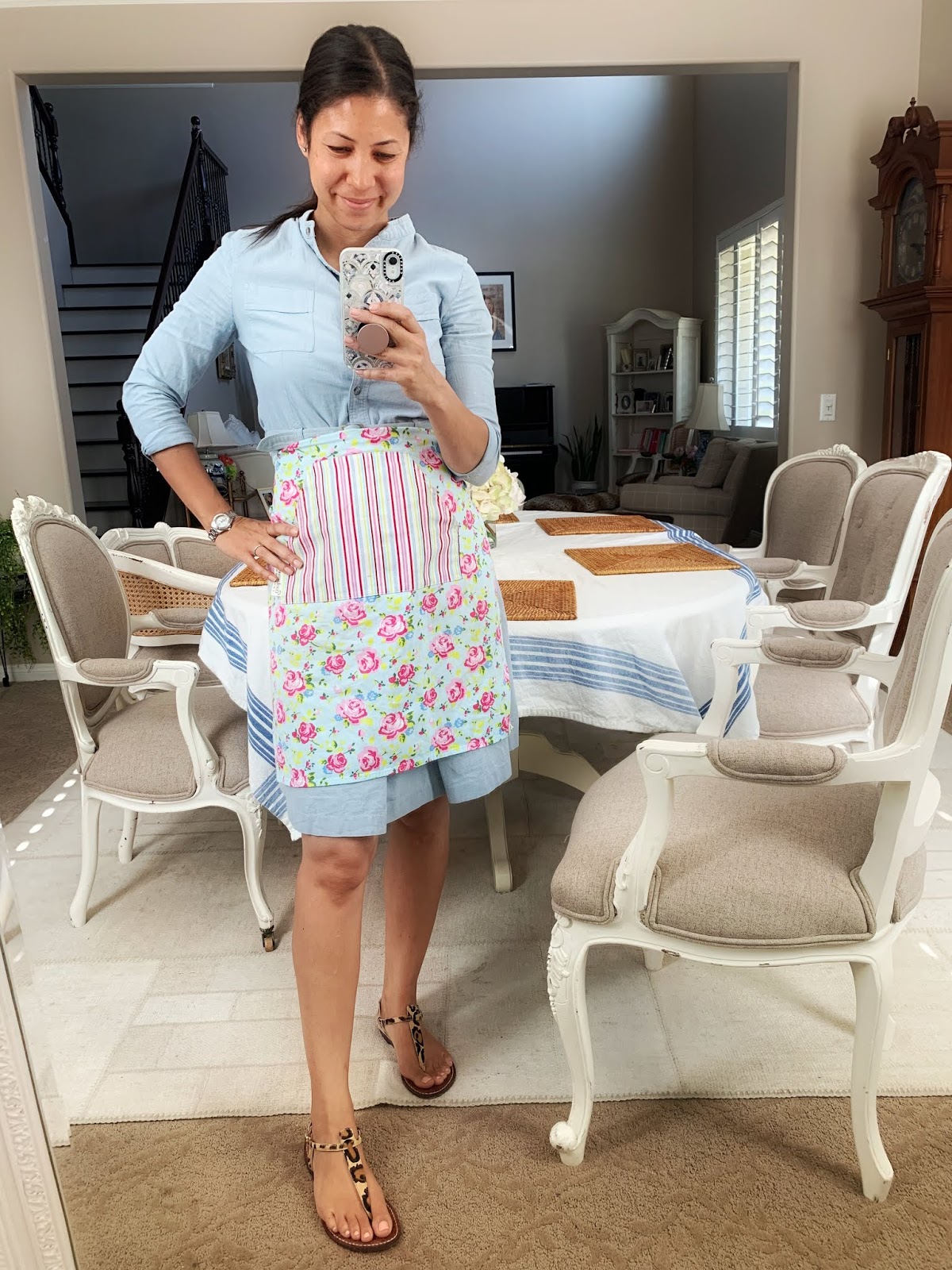 Thursday: I'm wearing the button-down chambray shirt dress (linking similar), floral apron (a gift from my mother-in-law), and leopard sandals.