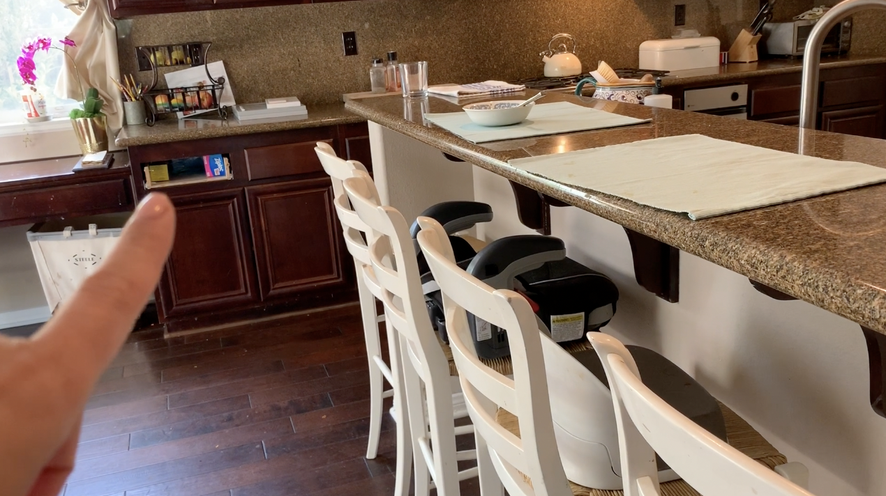 Ben, the girls, and I found ourselves sitting at the barstools to have our meals... we would usually be facing a sink of dishes. Meanwhile, the boys, would be in the high chair and another chair closer to the ground. We were all scattered, yet we didn't want to put a table next to the barstools because it would be too cluttered. With the really little kids we do not dine in our formal dining room everyday. With the upholstered chairs and carpet, it's just not practical. You will see our solution a few pictures down from here...