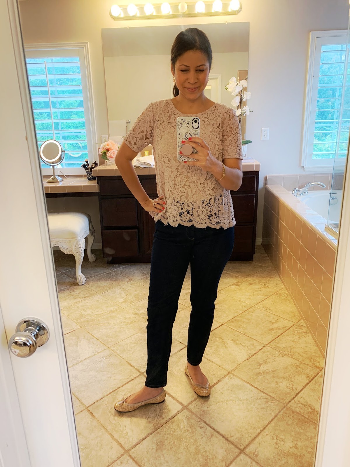 Blush lace tee, nude camisole, Mott & Bow mom jeans I LOVE these new jeans and will do a dedicated review. I reached out to the company to ask for a discount code. Use code JLS10 for 10% off