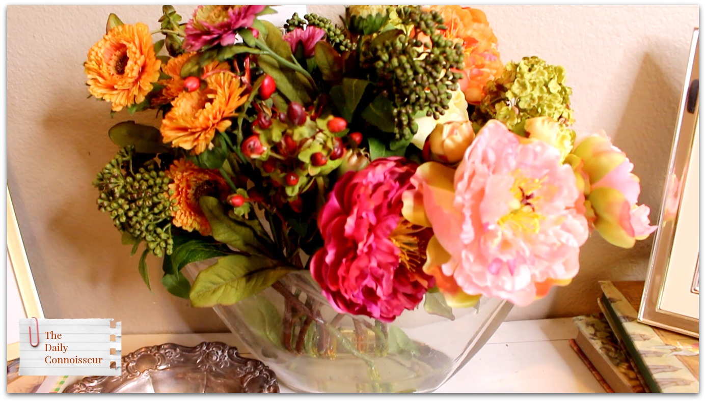 This is the second centerpiece I selected from Nearly Natural. I placed this one on our entryway table. It is beautifully crafted and the vase with faux water gives it such a realistic look. When it arrived, the stems were straight up (for shipping), I had fun arranging the flowers to make it look natural in the vase.