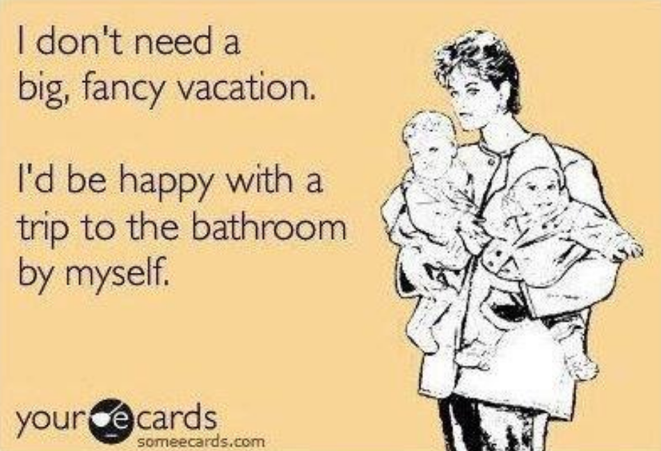 This is where I am right now. I don't need a fancy vacation, just a trip to the bathroom by myself, thank you very much!