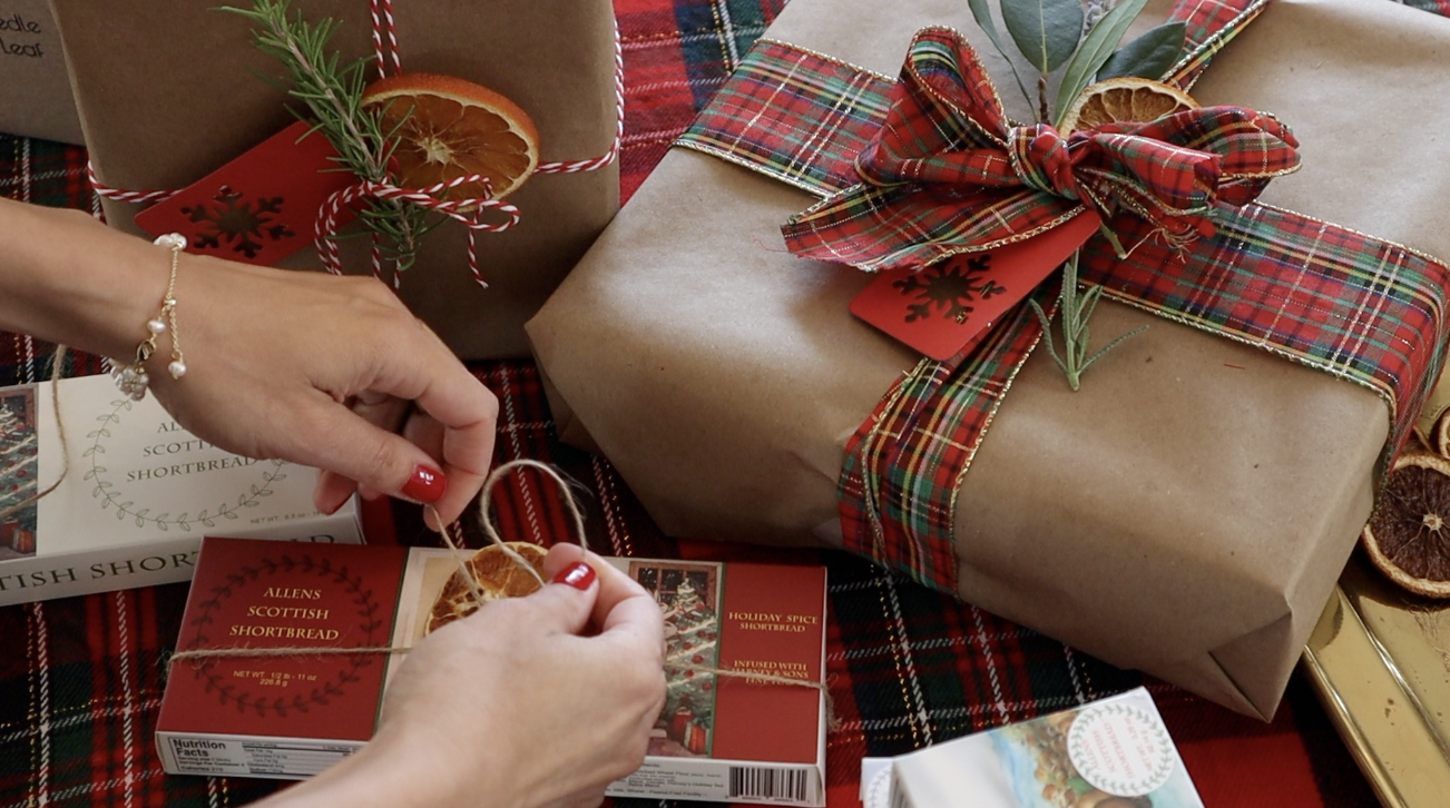 Welcome to a new day. I shared with you last year that I am done buying wrapping paper! It’s way too costly and I can never seem to find a print I totally love. So I have taken an affinity to the brown paper packages tied up with string approach. I use brown recycled craft paper to wrap my gifts and like to make them festive with bows, stamps, paint, gift tags, and other items from nature like rosemary, lavender, bay leaves, orange slices, and more. Wouldn’t you love to receive something wrapped like this? We are giving our neighbors Allens Scottish Shortbread this year. When the packaging for a product is this pretty, you don’t even need to wrap it! I am just tying it with string and adding a gift tag and orange and rosemary for decoration. I don’t know about you, but I’ve built up a big appetite for lunch.