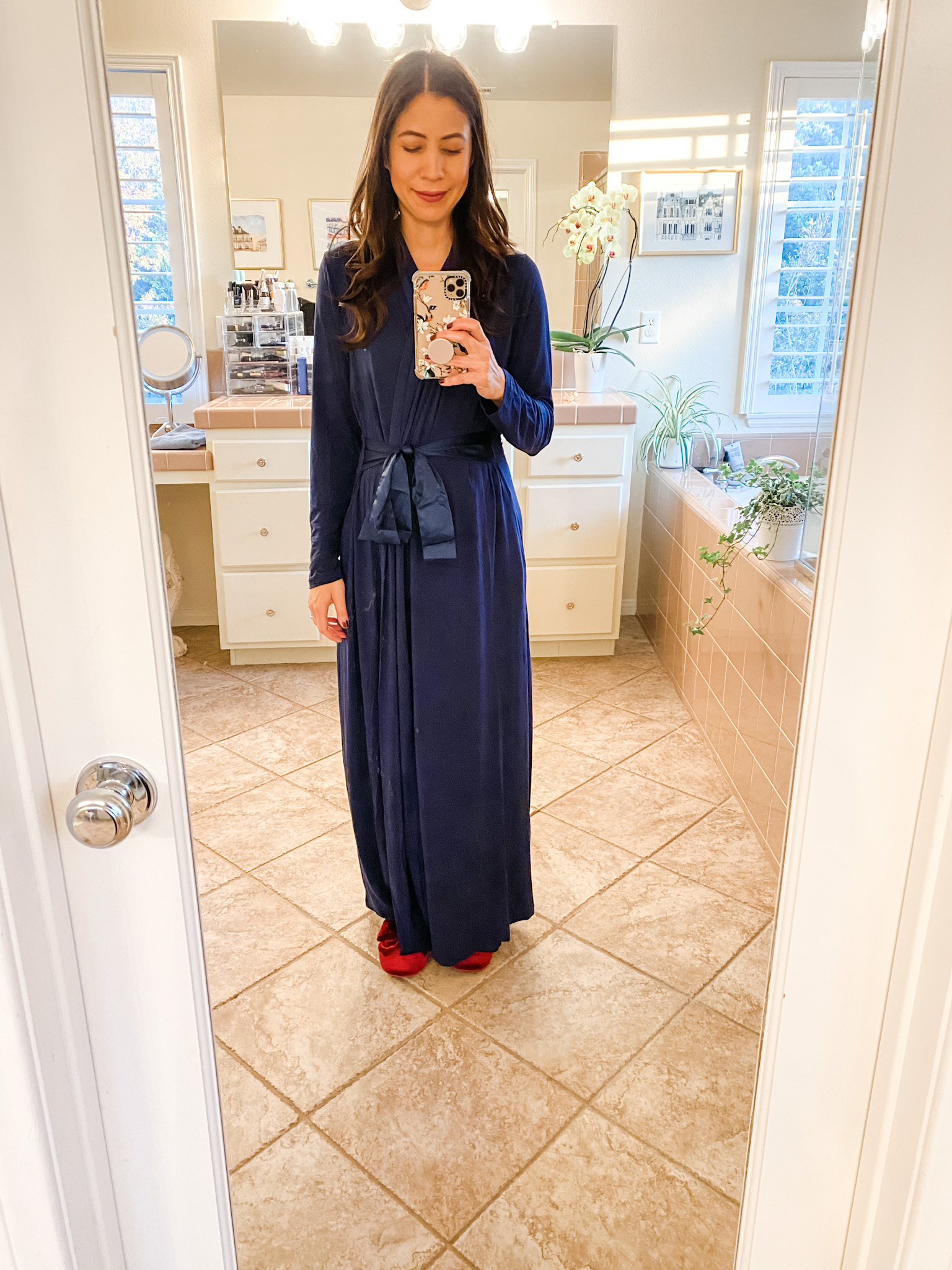 Midnight Blue Robe by Fleur't WINTER20 for 20% off and Red Satin Bow scrunchie from Amazon But first, it’s time to clean up the kitchen by candlelight… It’s been a long day of baking and ornament making.
