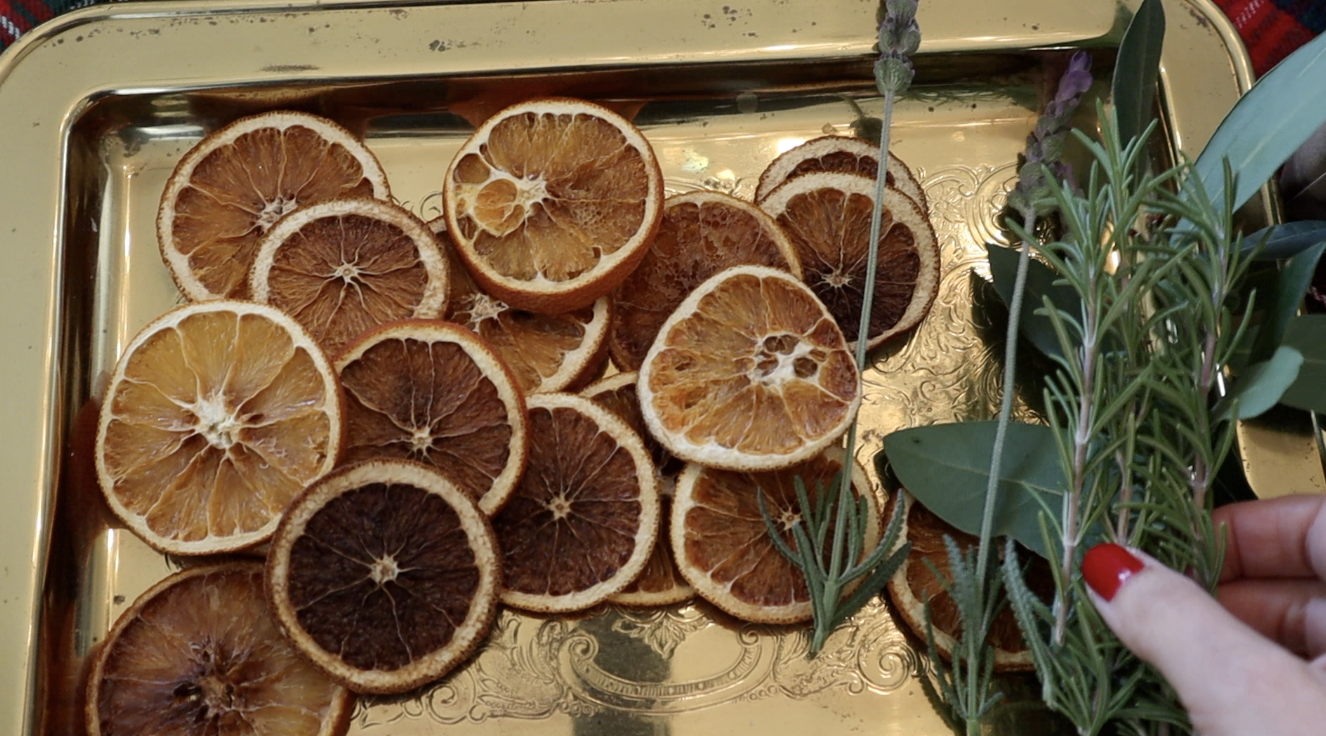 Now that I’m finished baking the muffins, let’s turn to the dried orange ornaments that I make every year. These take a few hours to prepare in the oven so I will prepare these tonight. They make the house smell amazing. Take your orange slices or whatever citrus fruit you’d like to use and slice thinly. Place on a baking sheet lined with parchment paper and bake at 200 degrees F for up to 4 hours. When they are finished I let them sit out overnight to fully dry. This is what they look like the next day. You can use these as ornaments for your Christmas tree, or to decorate presents like I’ll be doing tomorrow.