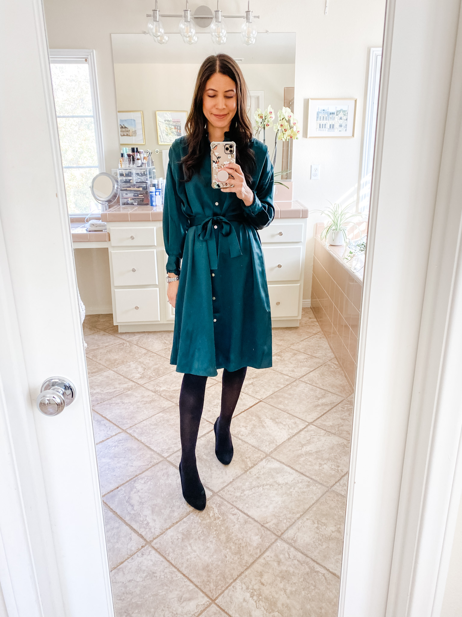 The star of the show is this gorgeous silk shirt dress from Lilysilk Daily15 for 15% off. This can be dressed up or down and is the perfect color for the festive season. I am wearing it with Hipstik tights JEN15 for 15% off, Jimmy Choo low heels, Jackie Mack Designs Necklace TDC15OFF for 15% off, SKYE crystal earrings Jennifer20 for 20% off. Alternately, it looks great with the Rachelyn Jewelry sun necklace JENNIFERSCOTT for 10%off .