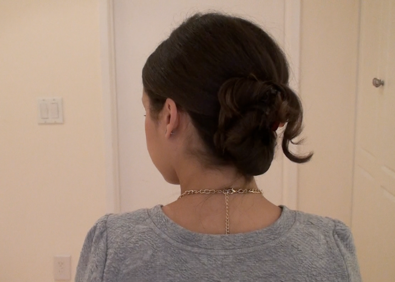 Be sure to tug the hair up at the crown of the head to create volume without having to tease.
