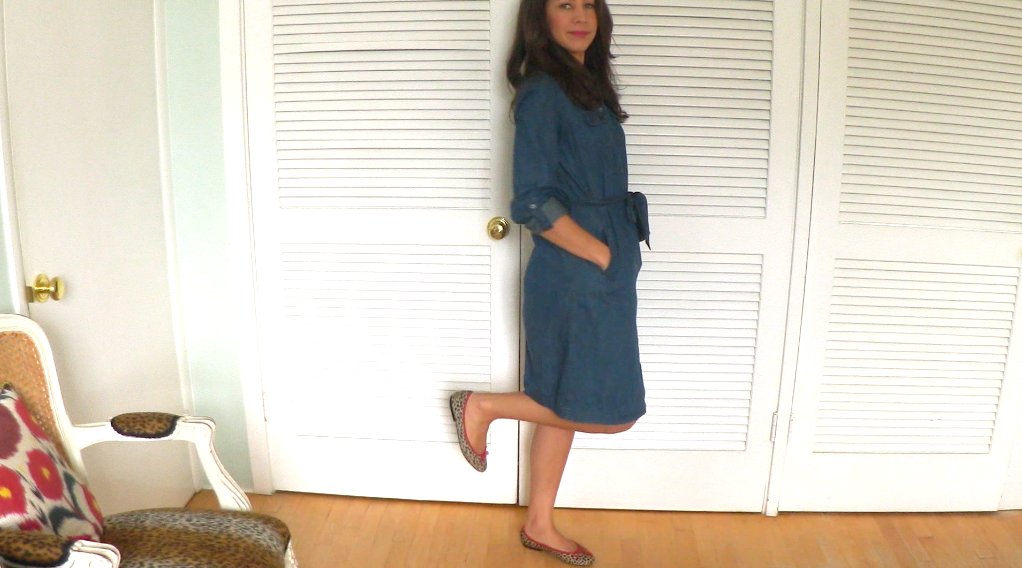 Tuesday shows my denim Talbots dress, a better hair day and London Sole pirouette leopard with red trim ballet flats.